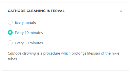 Interval čištění katod může být nastaven v následujících časových intervalech. Z hlediska účinnosti a životnosti digitronů jsou si tato nastavení rovna.